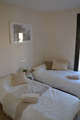Het appartement beschikt over drie slaapkamers, alle drie voorzien van inbouwkasten. De ruime masterbedroom heeft een tweepersoonsbed en een ensuite badkamer met ligbad en toilet.De andere twee slaapkamers bieden nog vier slaapplaatsen. De eerste middels een tweepersoons bed, de ander in twee eenpersoons bedden. Deze slaapkamers delen de tweede badkamer met douche en toilet. Bedlinnen, handdoeken en badlakens zijn allen aanwezig.